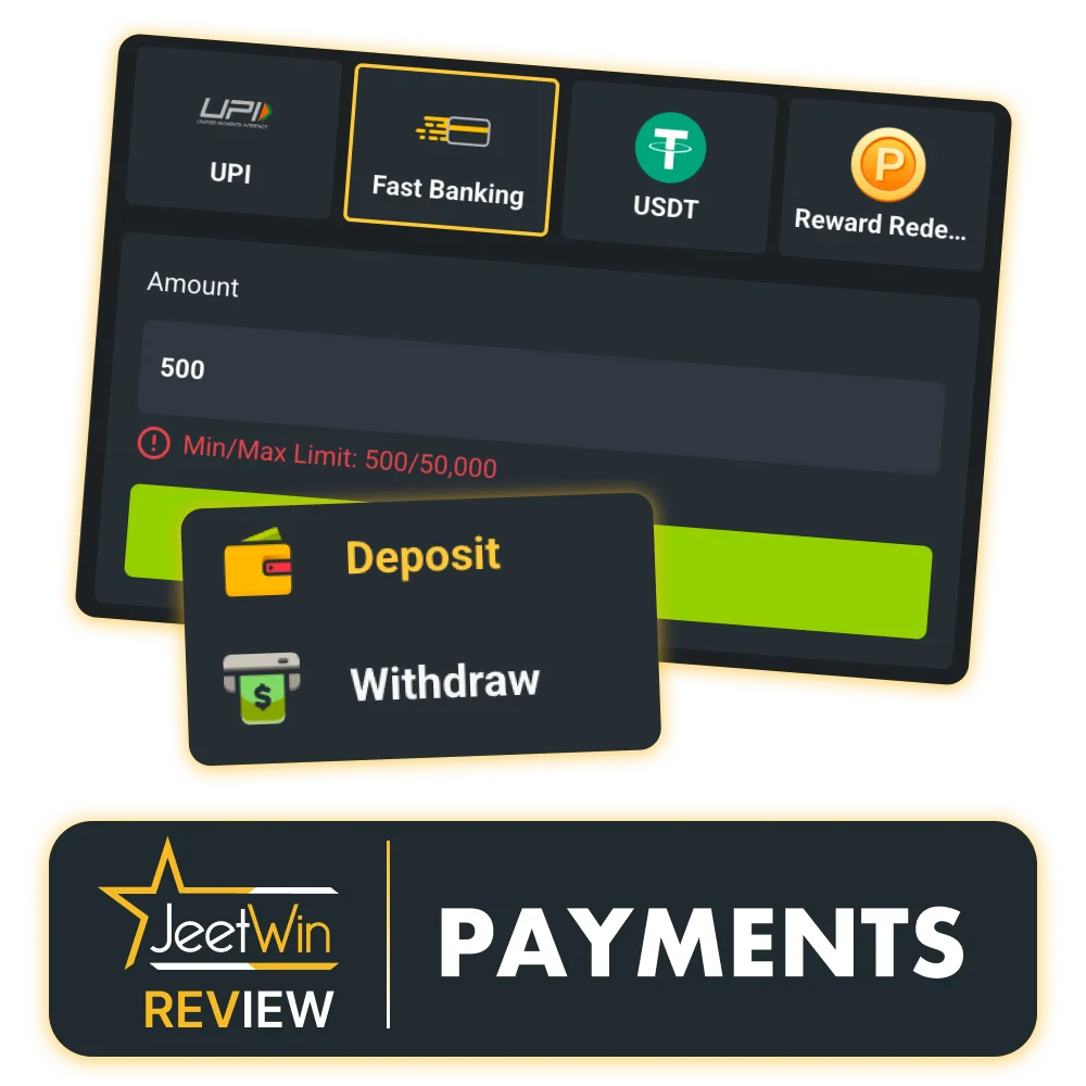 The JeetWin minimum deposit is ₹500 per transaction, subject to method caps.